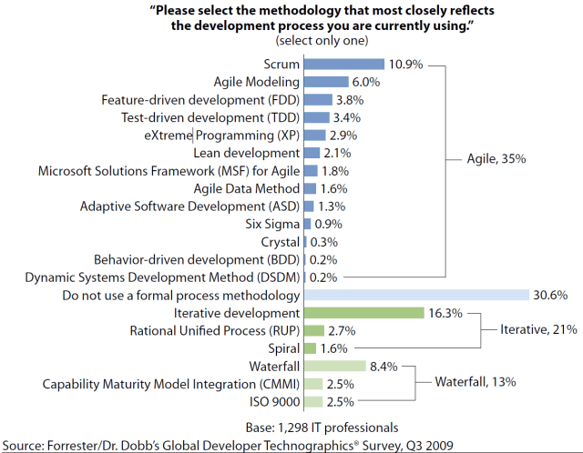Furthermore, agile really concentrates effort on a single unit of work-in-process.  This focus increases the efficiency of the effort and generally the quality of the results.  But let’s move right on to methodology coexistence.  The fact is waterfall is dying a not-so-slow-death.  Agile beats waterfall by almost a 3 to 1 margin.  Enterprises have abandoned waterfall in favor of agile according to a Forrester Global Developer Survey in 2009 and the disproportionality of the numbers is increasing all the time as you can see in the following figure: