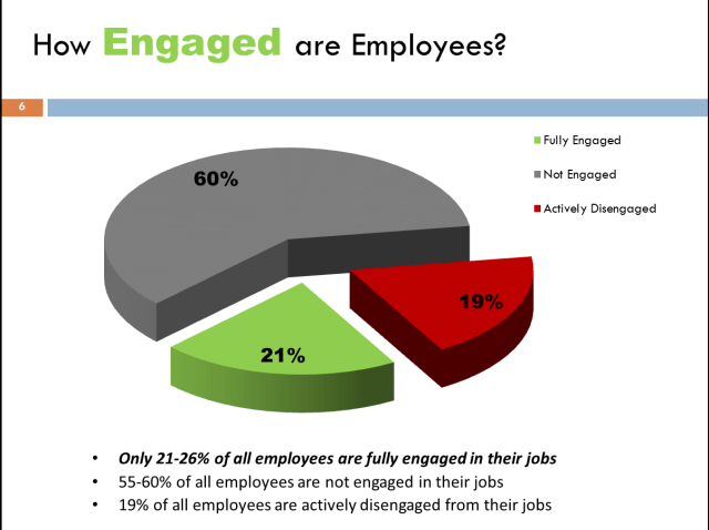 The bottom line is that not engaged and disengaged employees cost the organization huge amounts of money.  They are far less productive, have no company loyalty, and spread suffering and chaos from increased financial volatility and negative financial cycles.  All at a cost of $292-355 Billion dollars annually.  Companies need to reengage their employee if they are to survive.