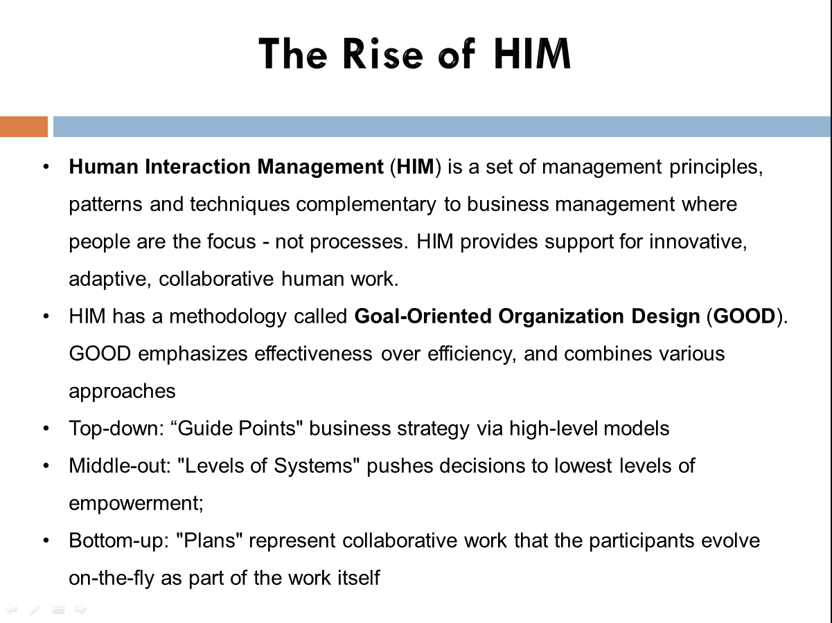 Human interaction management not only focuses attention on the people element of the system, but seeks to optimize the activity by understanding patterns and behavior and encouraging innovation and collaboration. HIM embraces a Goal Oriented Organization Design concept which is amazingly similar to an agile team structure.  Both are based on lattice organization structures that were first popularized by W.L. Gore.