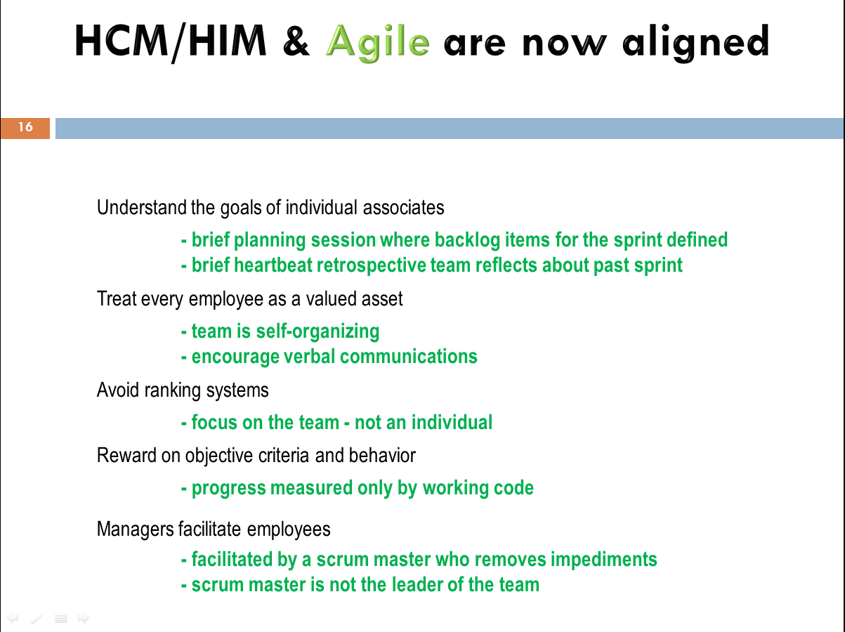 Human Capital Management, Human Interaction Management and Agile are now very much in alignment.  An individual associate’s goals are coordinated with the goals of short term efforts which advance both causes.  The natural collaboration of an agile team and its self organization lend themselves to the treatment of employees as valued assets and ideas judged on merit.  Ranking systems are an anathema to any well run organization or agile effort; in agile the focus is on the team.  Rewards are made in both cases based on objective criteria; in agile that means working code – you can’t get much more objective than that.  The final is one of the most important constructs: Managers facilitate employee creativity and productivity; they don’t order activity by fiat.