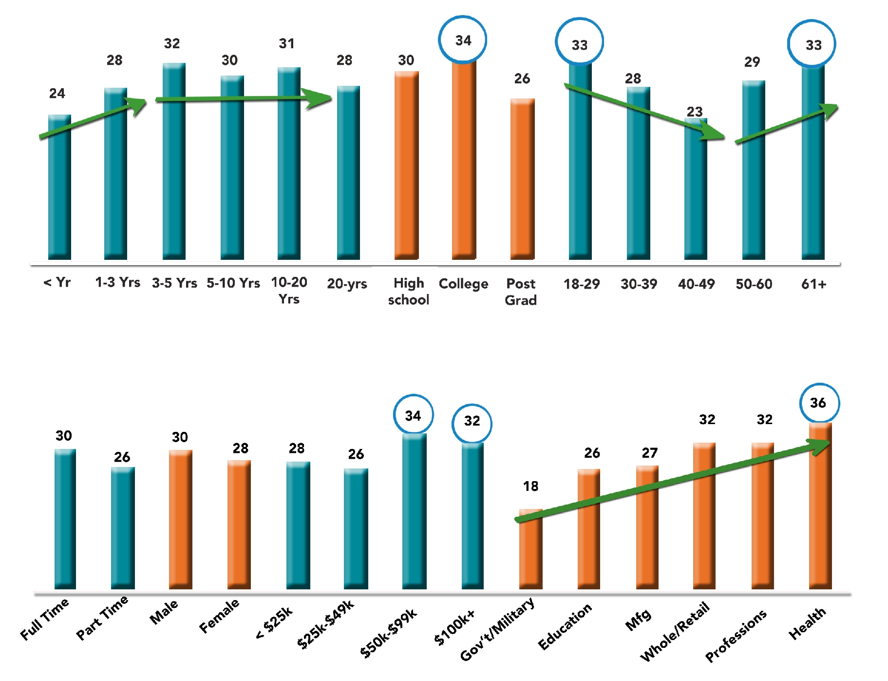 • Comparatively, demographic and organizational segments currently less engaged or disengaged with their organizations are: