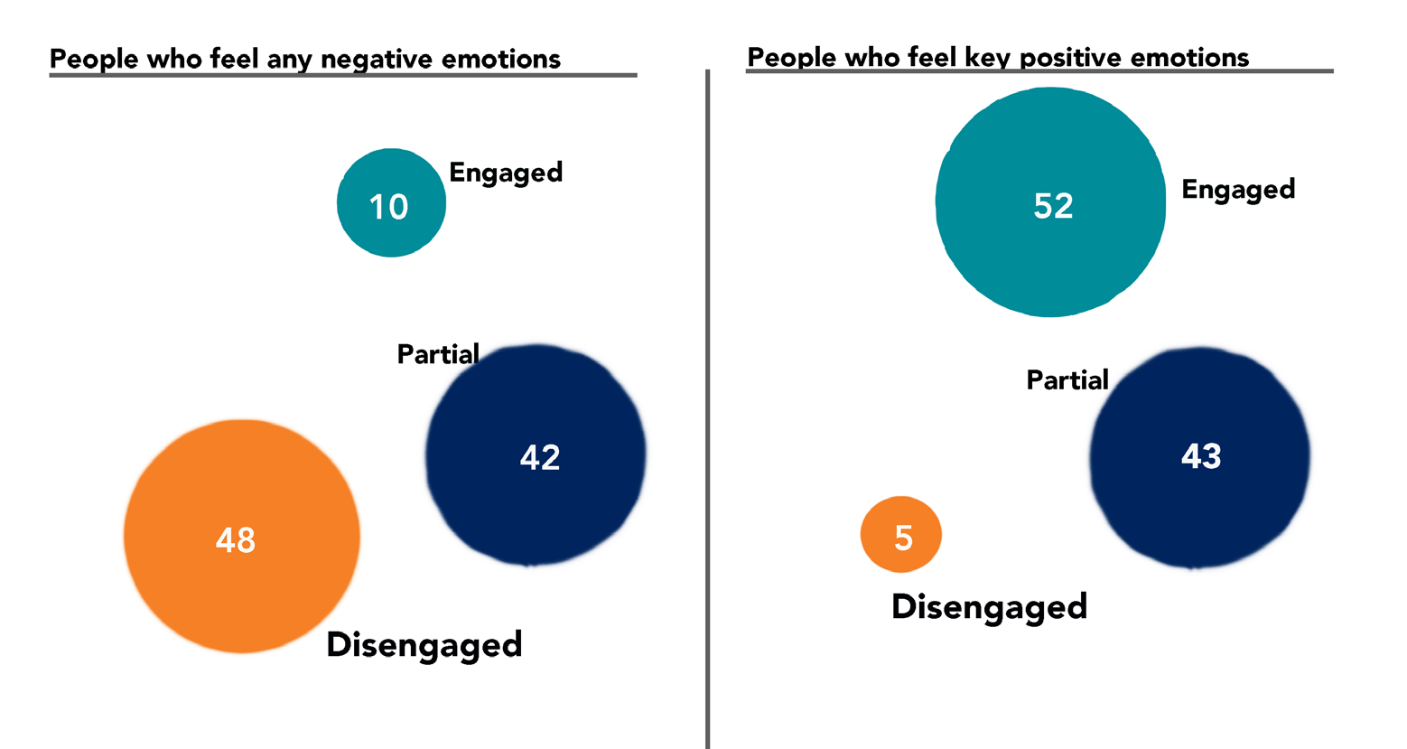 There is a direct relationship between negative emotions and an employee’s level of engagement. Employees who feel negative emotions are disengaged nearly ten times more than employees who feel positive emotions. Almost three in ten employees feel at least one of twelve significant negative emotions as a result of their interaction with their immediate supervisor.